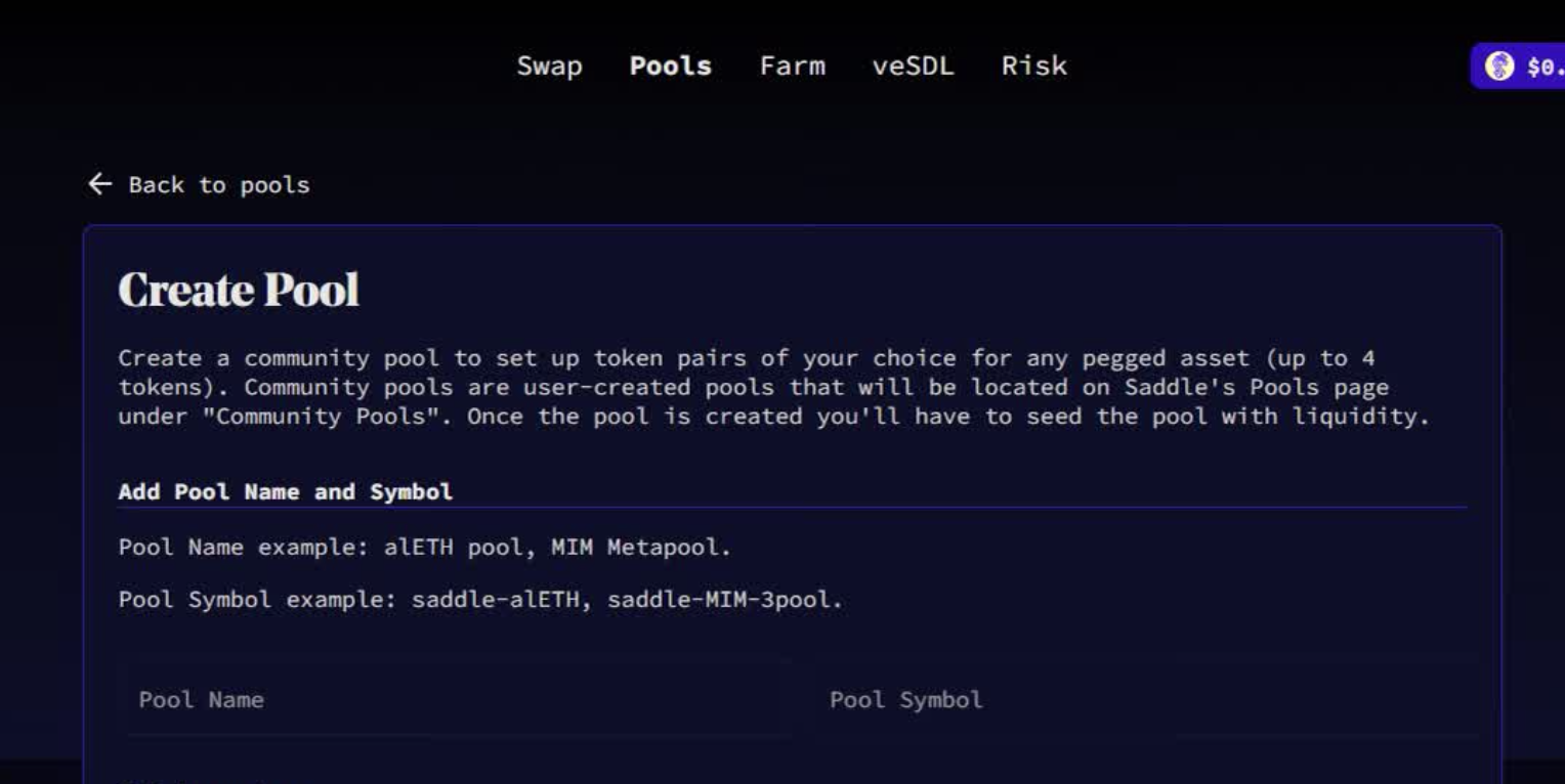 * The Pool Symbol is the name that will display on the list of pools on the Saddle frontend. It is good practice for the Pool Symbol to indicate what tokens are in the pool.