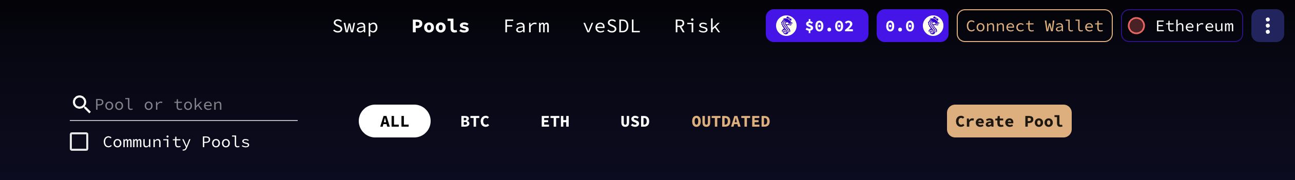 1. First, navigate to the Saddle dApp, select the “Pools” menu, and select “Create Pool.”