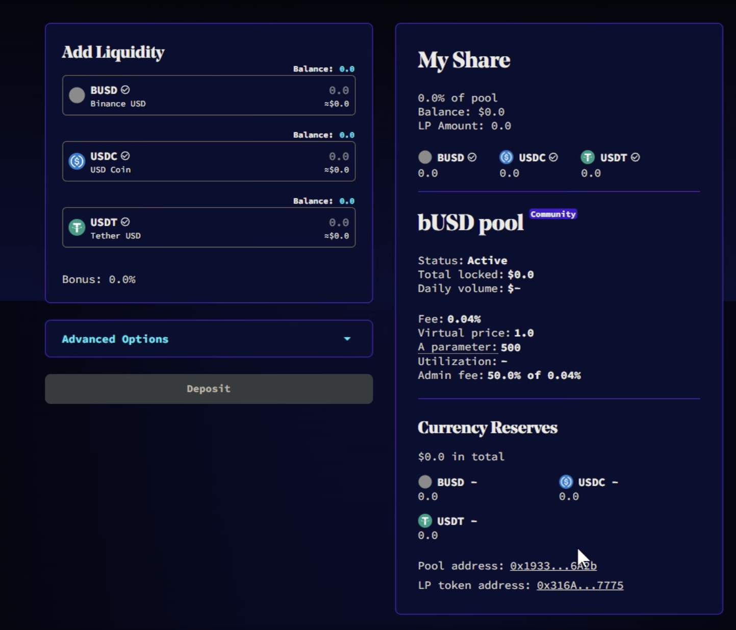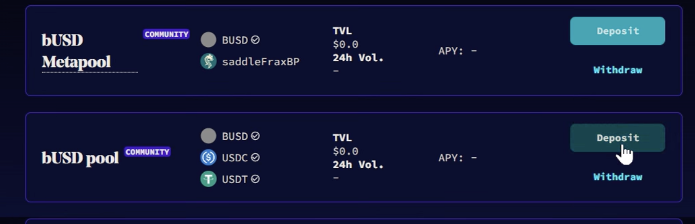 Go to <https://saddle.exchange/#/pools> and navigate to the Community Pool you want to provide liquidity to. Click `Deposit`.