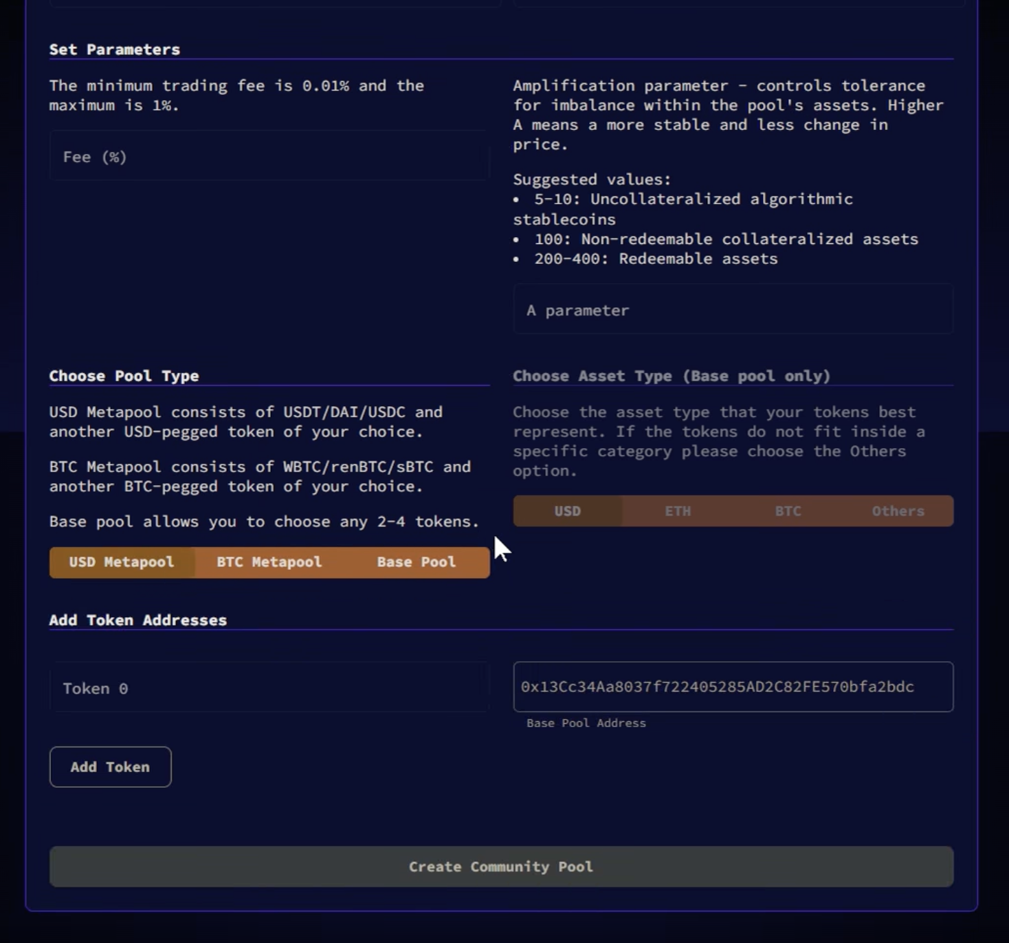 * The three options for Pool Type are USD Metapool, BTC Metapool, and Base Pool.